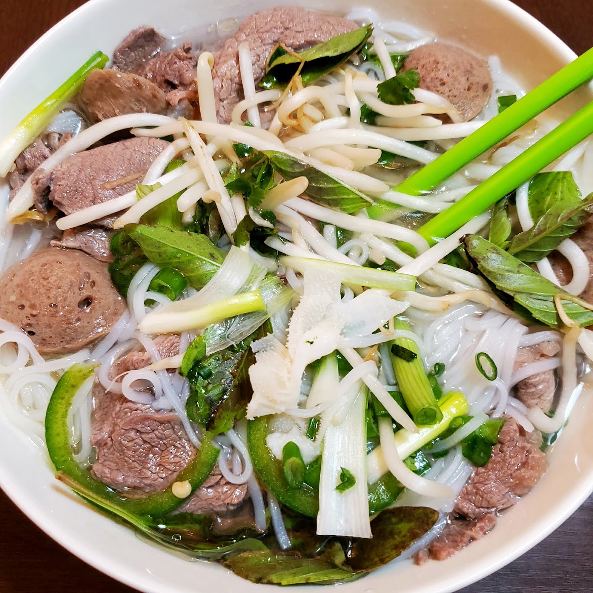 I found this place on Google. Saw some good reviews and figured, why not? Walked in, and BAM! Skittles machine! Like, a huge one. Definitely bringing the kids next time. Then there's a Street Fighter 2 arcade, a cute little flower shop, and a merch counter – all super green. Took me a sec to process, but honestly, I was digging the vibe. I went for the monster pho – the house special with all the meats. My friend always says you can tell a good pho by the broth, and this one? Clear-- not like those murky ones you get sometimes. And it tasted amazing! Noodles were perfect, and all the meat was fresh and cooked just right – especially the tendons, loved those. Then, I had the fried bananas with ice cream. Those were awesome! They're like, little banana egg rolls shaped like mini tabletop footballs, and they're sweet and crunchy and just perfect with the ice cream. I'm getting those again.
